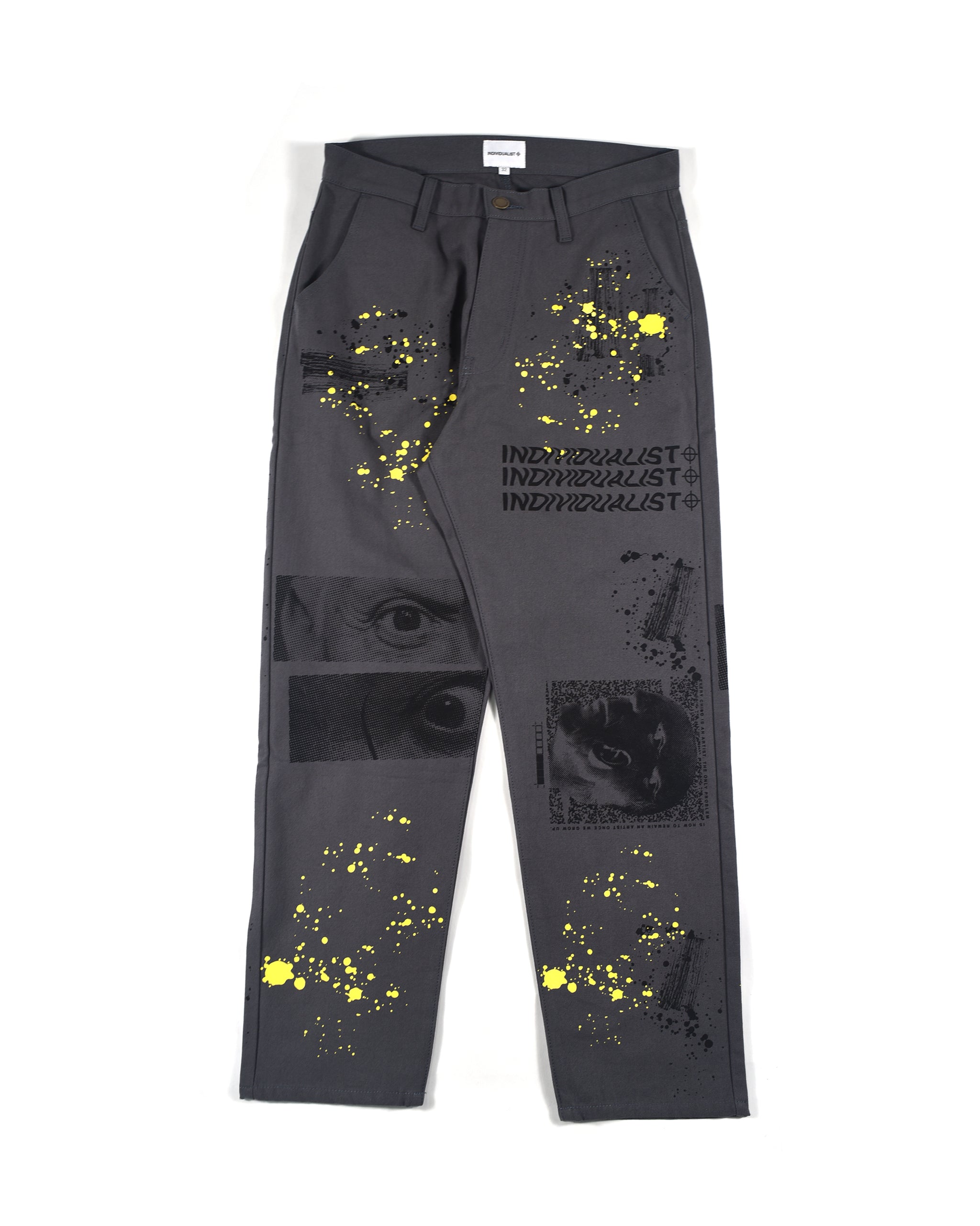 Cotton canvas pants. Literally a canvas to hand pulled prints. Eyes of the beholder art work, paint smudges and splatter applied with intentional composition. Expect variance in placement from pair to pair will be natural.